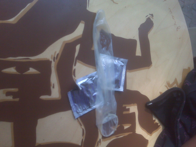 Un lindo condón. Estaba nuevo, ósease limpio. A lo mejor es una nueva campaña de concientización respecto al uso del preservativo. Si los ves en todos lados seguramente no se te olvidará usarlo a la hora de la hora. O tal vez son los nuevos sabores. Ya puedes pedir un caramen machiato con extra crema batida, un shot de café por $6.00 más y un condón venti. Ya te lo van a servir en uno de esos. En lugar de usar vasos reciclados, usarán "látex" reciclado! Lo podrás usar como duya. Han visto más de esos en su cafetería más cercana???